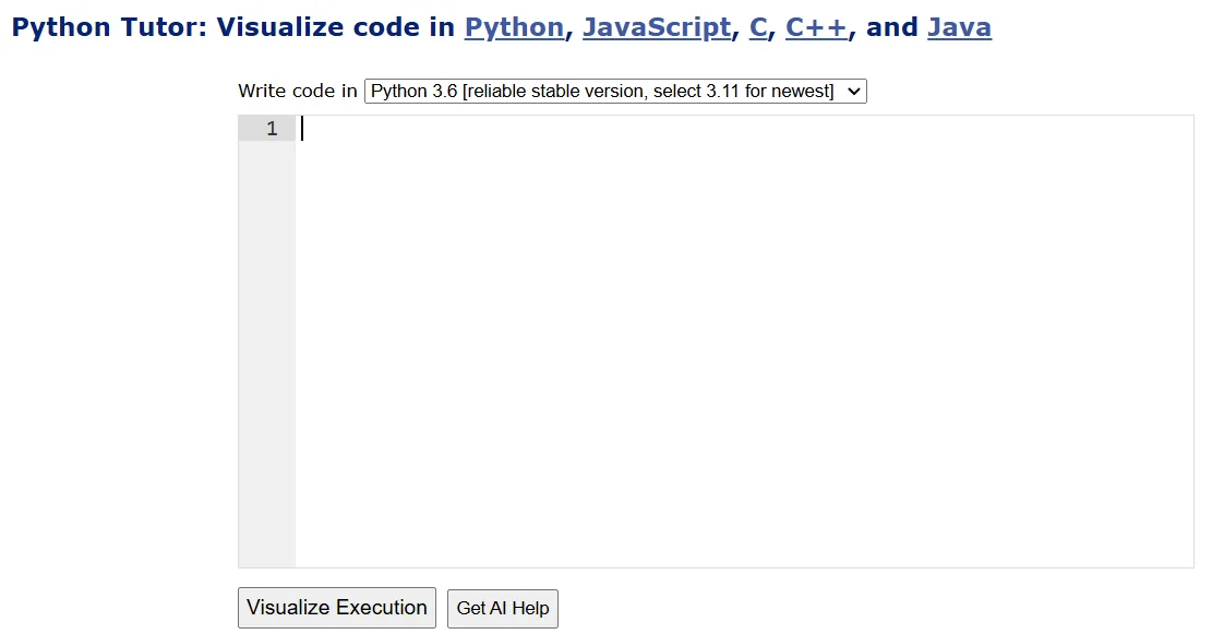 Один из самых популярных инструментов для пошаговой визуализации работы кода. Поддерживает Python, Java, JavaScript, C, C++. Вы можете написать или вставить код, и Python Tutor покажет, как выполняются инструкции, как создаются переменные, что хранится в памяти и как изменяются значения.